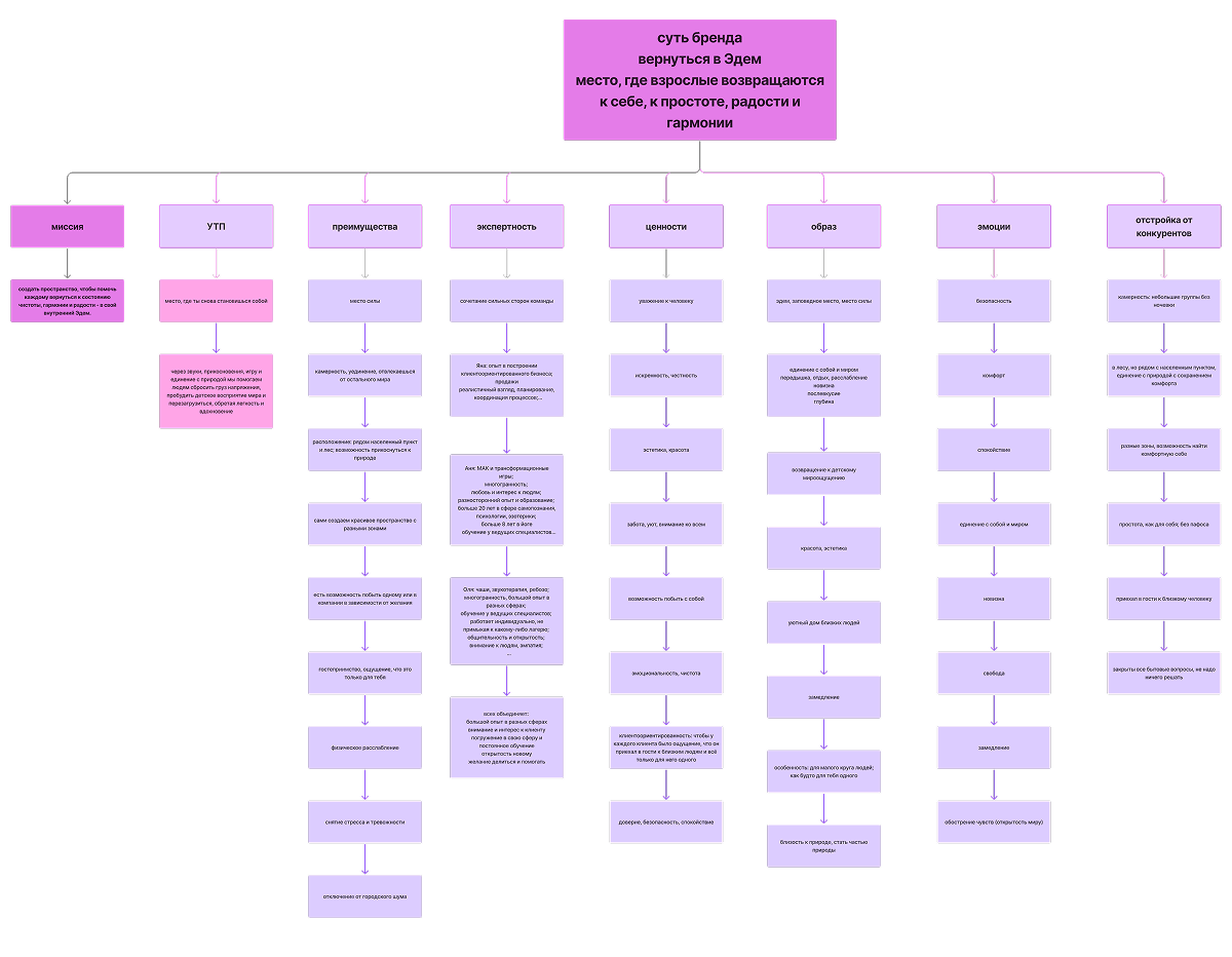 В результате глубинных интервью с основателями, анализ аудитории и ниши мы собрали «скелет» бренда — то, на что проект сможет опираться дальше, когда появятся сайт, контент, первые заезды и новые форматы. В основе зафиксировали смысловой образ «возвращение в Эдем»: не как красивую метафору, а как короткое объяснение сути — «вернуться к простоте, гармонии и ощущению, что мир добрый».
