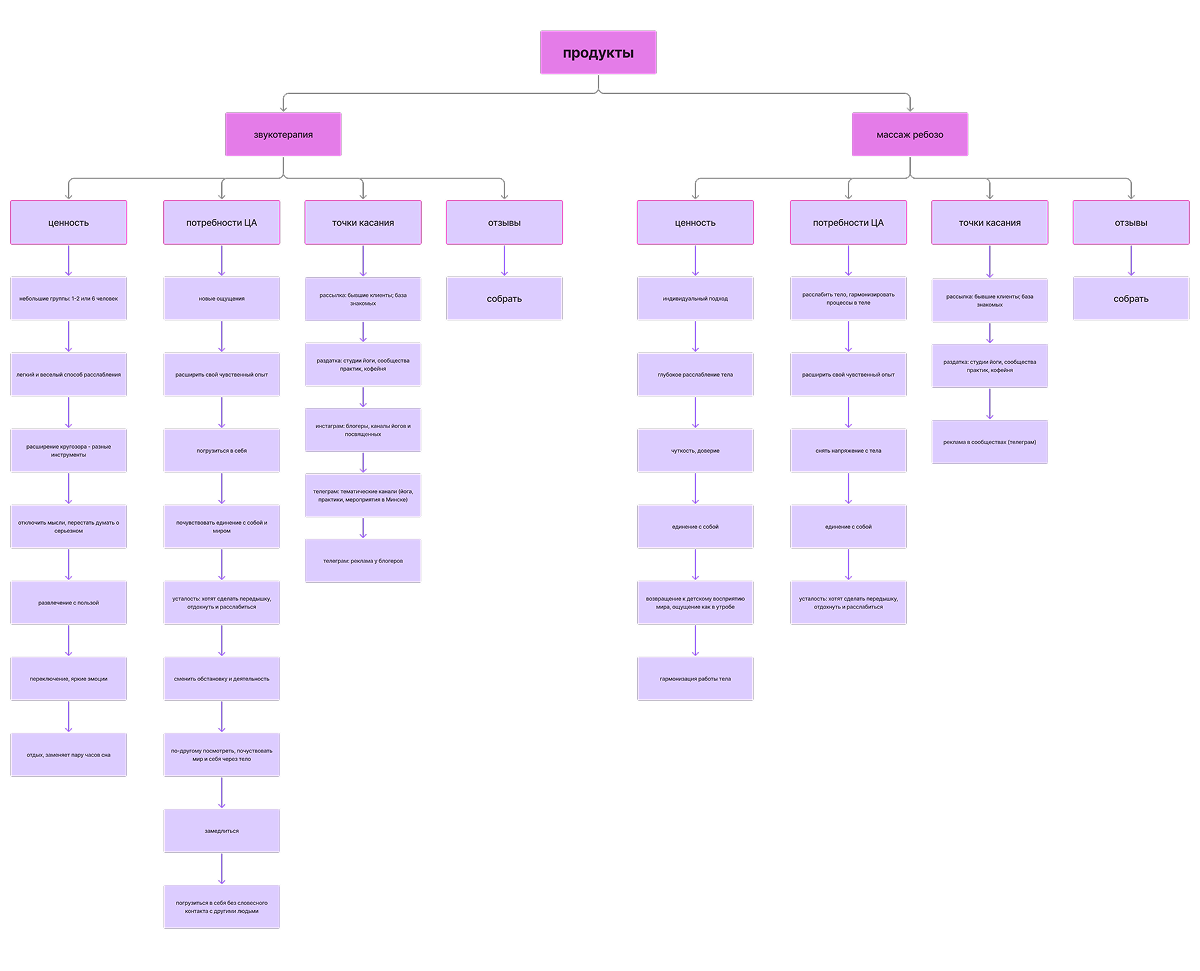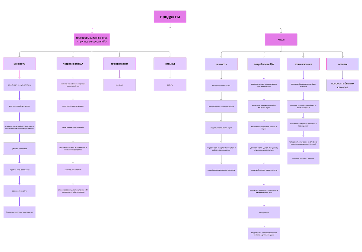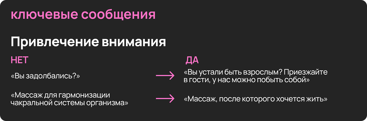 Дальше оформили бренд как систему: «миссия» и «видение», «ценности», «характер» и архетип «Дитя» в высокой версии — тёплый, искренний, простой, но без инфантильности. Прописали аудиторию и её внутренний запрос, собрали атрибуты и преимущества бренда (что человек получает на уровне опыта, тела, эмоций), а также сформулировали позиционирование, УТП и отстройку от конкурентов. В итоге появилась ясная база, по которой легко принимать решения: что запускать, как объяснять, на что делать акцент, а что не делать вообще.